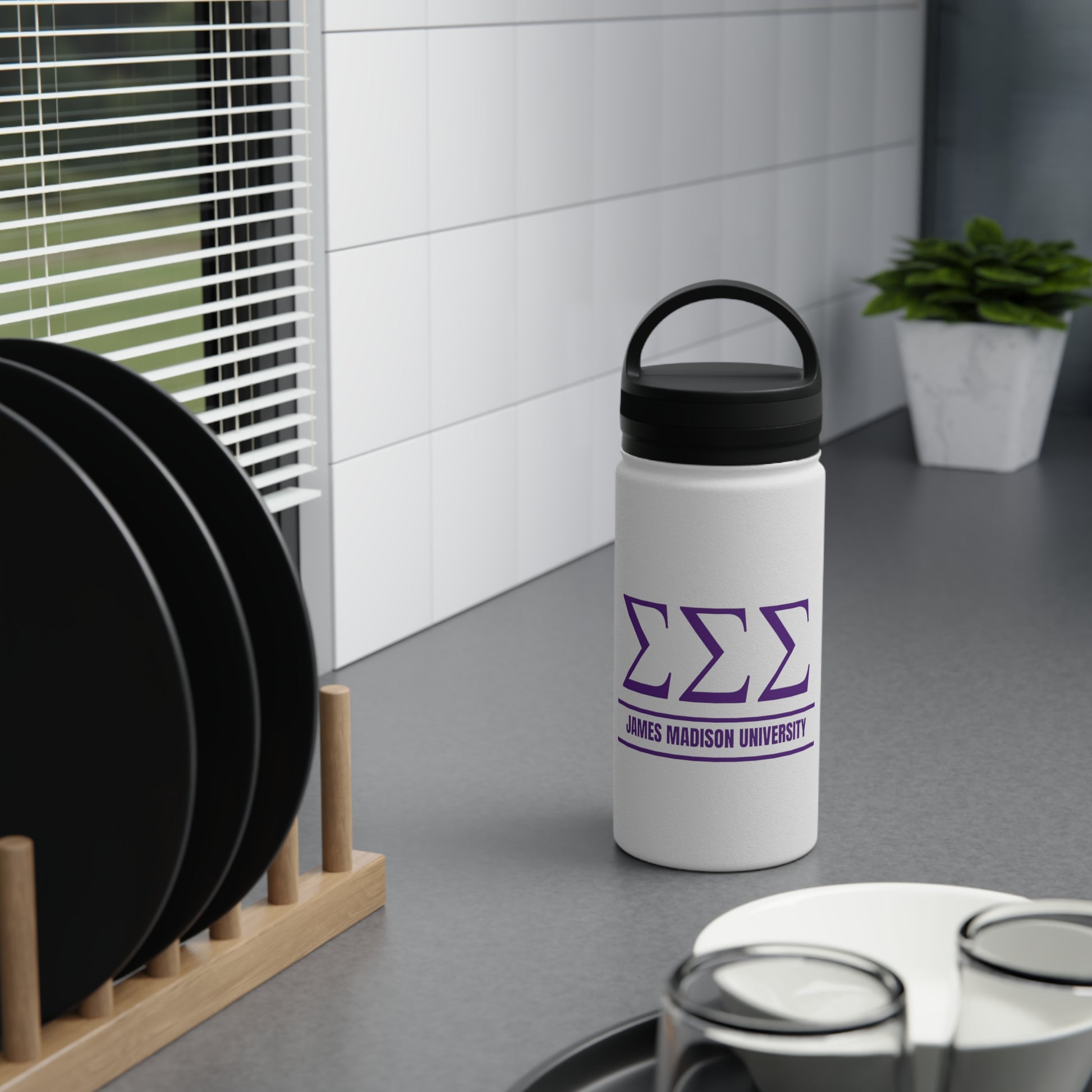 Quench your thirst in style with this stainless steel water bottle made for adventures. Available in 3 sizes (12oz, 18oz, 32oz), this water bottle features a double-wall stainless steel build that keeps your drinks warm for 12h and cold for 24h. This BPA-free, robust adventure companion comes with a handle lid, making it effortless to carry wherever your day takes you.